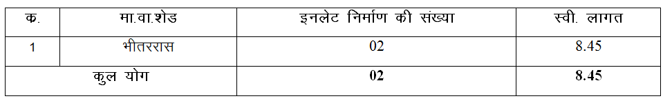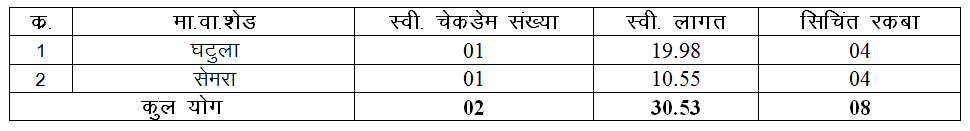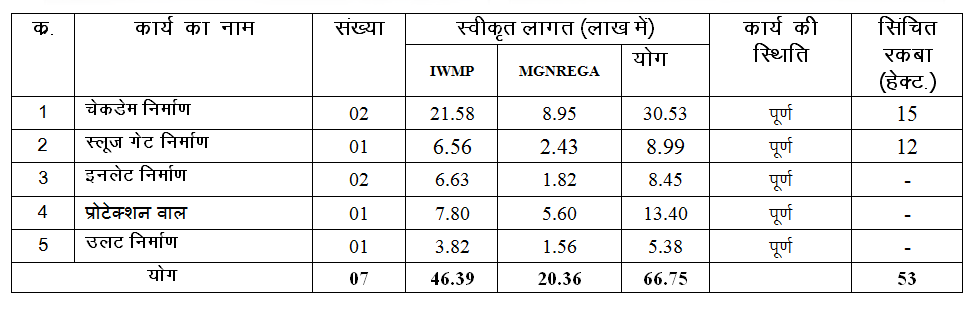 परियोजना अंतर्गत वर्ष 2017-18 हेतु कुल 4 नग चेकडेम निर्माण कार्य स्वीकृत हुआ है। स्वीकृत कार्य अभिसरण (Convergence) के अंतर्गत कराये गये हैं। जिस हेतु IWMP से 33.07 लाख रूपये एवं डळछत्म्ळ। से 11.50 लाख रू. कुल 44.58 लाख रू. की स्वीकृत प्राप्त हुई है। जिसमें कार्य 02 पूर्ण व 02 कार्य वर्ष 2018-19 में पूर्ण किया गया। हैं।