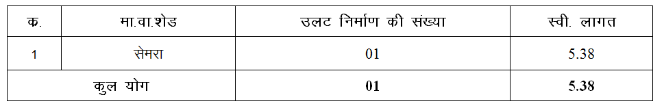 वर्ष 2017-18 में परियोजना क्षेत्र में सम्मिलित ग्राम- सेमरा में तालाब में उलट निर्माण कार्य किये जाने हेतु अभिसरण अंतर्गत स्वीकृति प्राप्त हुआ था। स्वीकृत निर्माण कार्य IWMP से 3.82 लाख रू. एवं MGNREGA से 1.56 लाख रू . कुल 5.38 लाख रू. की स्वीकृति प्राप्त हुई थी। जिसे वर्ष 2018-19 में पूर्ण किया गया।