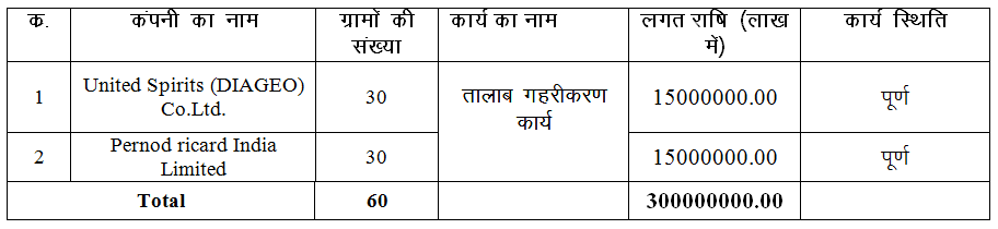 संस्था द्वारा लगभग 60 ग्रामों जो कि पानी की समस्या से अत्यन्त प्रभावित वे उनका प्रस्ताव व प्राक्कलन तैयार कर कार्यो का संपादन CSR के माध्यम से किये जाने हेतु United Spirits (DIAGEO) Co.Ltd. को अपना प्रस्ताव प्रेषित किया गया। तत्पष्चात् संबंधित CSR मद प्रदायित करने वाले कंपनी के उच्चाधिकारियां से संपर्क स्थापित कर संबंधित ग्रामों की समस्याओं से अवगत कराया गया।