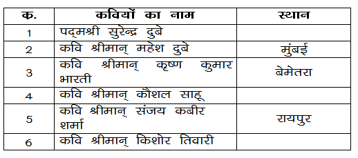 संस्था द्वारा कार्यालय कलेक्टर जिला राजनांदगांव (..) कार्यादेष क्रमांक 5334/ज्ये. लि. - 2/2018 राजनांदगांव, दिनांक 02.06.2018 कवि सम्मेलन संचालनालय, संस्कृति एवं पुरातत्व रायपुर द्वारा कार्यक्रम आयोजन किया गया है। सभी राजनांदनां कवि सम्मेलन का आयोजन सफलतापूर्वक किया गया।
